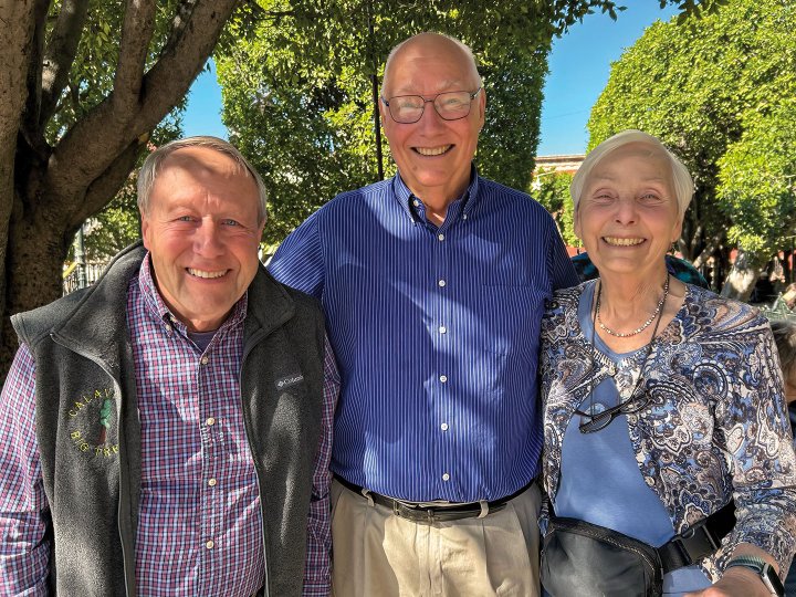 John McWilliam '67 (center) and his sister Susan McWilliam Fisher '63 met up with John's Chi Phi fraternity brother Randy Conklin '67 (left) in San Miguel de Allende, Mexico, in February. (Photo courtesy of John McWilliam '67)