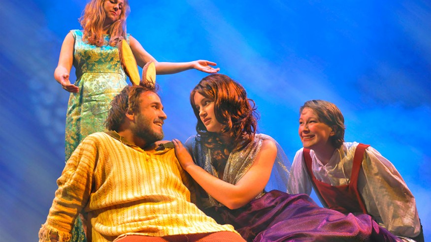 Ohio Wesleyan University will stage ‘The Fairy Queen,’ a musical treatment of Shakespeare’s ‘A Midsummer Night’s Dream’ for five performances in November. The play will feature, from left, junior Rachel Parfenchuk of Powell, Ohio, as ‘Spring’; junior Nick Ehlers of Fort Wayne, Ind., as ‘Bottom’; junior Claire Hackett of Chevy Chase, Md., as ‘Titania’; and freshman Hannah Simpson of Lincroft, N.J., as ‘Puck.’ The performance will include special rigging to allow Puck and other characters to fly in this joint production between the university’s departments of music and theatre & dance. (Photo by D. Glen Vanderbilt)