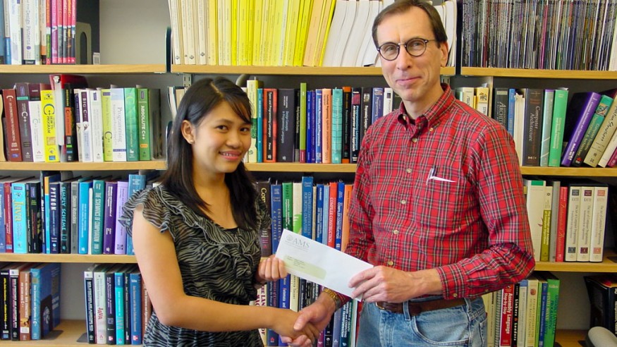 Ohio Wesleyan student Amina S. Mendez accepts a $3,000 Trjitzinsky Scholarship from the American Mathematical Society (AMS). Presenting the scholarship is Alan Zaring, chair of the OWU Department of Mathematics and Computer Science. (Photo courtesy of the American Mathematical Society)