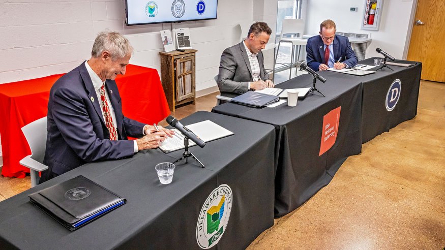 Delaware County Commissioner Gary Merrell, Ohio Wesleyan President Matt vandenBerg, and Delaware City Manager Tom Homan sign an agreement continuing their collaboration in operating The Delaware Entrepreneurial Center at Ohio Wesleyan University. (Photo by James DeCamp)