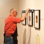 Justin Kronewetter, director of Ohio Wesleyan University’s Richard M. Ross Art Museum, works to install ‘FA8,’ the biennial faculty art exhibit. The show…
