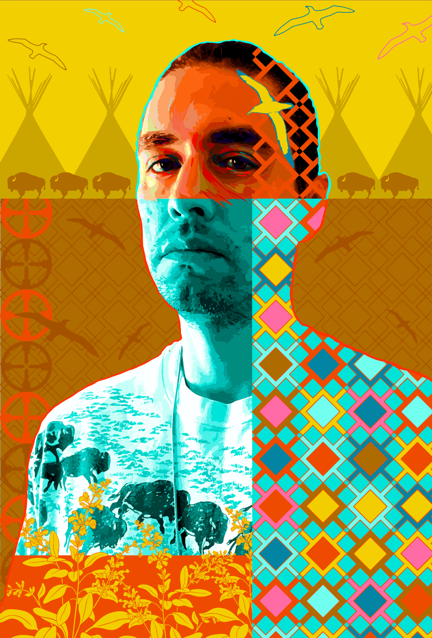 The diamond-shaped pattern is repeated throughout the design, in the background and overlapping with the individual. This pattern is representative of the 'Morning Star' symbol of the Northern Cheyenne Nation. This design is seen prominently on the Cheyenne flag and signifies the future survival of the Cheyenne people. The illustration position grows vibrant and colorful when overlapping with the individual to emphasize the importance of this celebrating identity and how identity is woven into individualism.