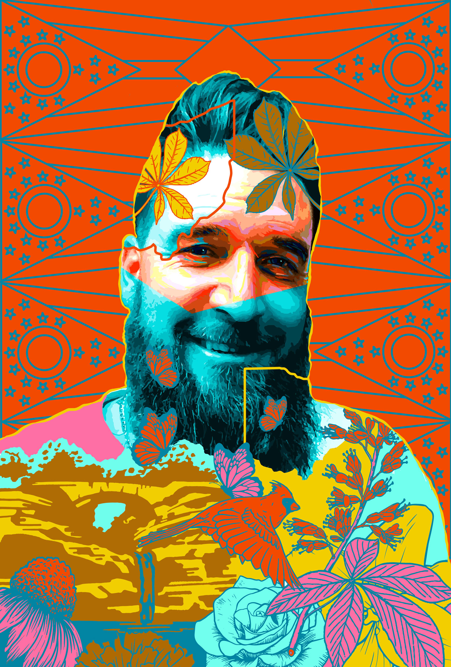 The mural shows the man smiling, with the Ohio state flag repeated in the background and Ohio state outlines overlapping his face. This is representative of the individual's identity within the greater Ohio community. Various cultural aspects of Ohio are represented in the design, such as Old Man's Cave, the monarch butterfly, the cardinal, and state flowers, in vibrant, dynamic colors to show a deep connection and tradition.