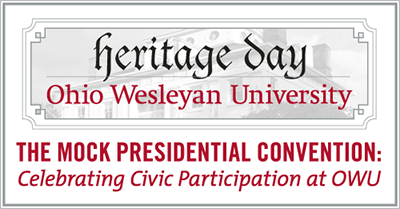 The third Heritage Day was a great success and all who took part had a fun time. The topic was the history of the Mock Presidential Convention and civic participation at Ohio Wesleyan University. Dr. Craig Ramsay, Chair of the Politics and Government Department at Ohio Wesleyan, helped to guide the audience from the first Mock Convention in 1884 up through the next Mock Convention in 2012. Along this journey, various speakers came up to add insight and personal stories about what they remember from the Mock Convention and civic participation at Ohio Wesleyan. Benjamin F. Marsh, Class of 1950, spoke of Professor Ben Arneson, who had revived the Mock Convention in 1920 after a 28 years hiatus in holding the event. Jon Peterson, Class of 1976, and Dave Staley spoke of acting as chairs for various Mock Conventions over the years. Jon Peterson chaired many Republican conventions, while Dave Staley chaired many Democratic conventions. Jon Peterson also spoke of his father Art Peterson, who helped to run the Mock Convention as a professor at Ohio Wesleyan. Professor Joan McLean and Professor William Louthan discussed their memories of many of the recent conventions. Professor McLean has been the Faculty Advisor for the Mock Convention since 1996. Professor Louthan has been the Parliamentarian since 1972. Laura Hausman, Class of 1984, and Nicole Daily, Class of 2000, were members of the Mock Convention in 1984 and 2000, respectively. They spoke of their work and what they remember from the conventions. Laura Hausman was also able provide a unique perspective since she worked as the Faculty Advisor in 1992. Dan Sharpe, Class 2005, spoke of building the stage for the 2004 Mock Convention. All the speakers spoke of civic participation and how it is so crucial for everyone to be involved.
