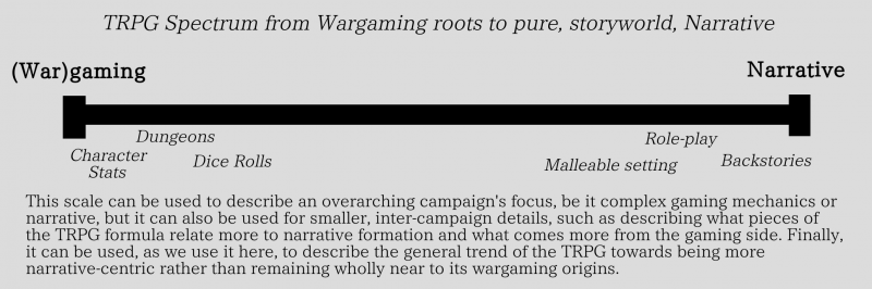 Thus, the TRPG offers infinite character creation choices and infinite in-game character choices. This heightened emphasis on freedom has accompanied the TRPG's general shift towards a narrative focus. While, as stated above, the TRPG had its start in wargaming—and still very much holds on to many of those elements in combat—the TRPG has shifted towards more interest in storytelling and in role-play, rather than in battle. Fighting may still be common in a TRPG campaign, but narrative elements have become the primary draw to the form for most. Of course, there are still those who prefer the TRPG's wargaming-related elements, and there are some TRPG systems that still heavily emphasize those elements, but the general trend over the decades has been a shift towards narrative interest. Mostly gone are the days of endless dungeon crawls and extreme good triumphing over extreme evil, and come have the days of in-depth role-play, overarching plot intrigue, and more nuanced characters and story.