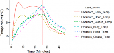 Data of body, head, and cloaca temperature from both the live lizard (François) and the 3D model (Charizard) over time. The red line bisecting this graph indicates when the heat source was removed, marking the beginning of the cooling period.
