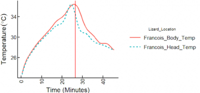 As for the second hypothesis, regarding the presence of regional heterothermy within P. muralis , the statistical data and analysis confirmed our suspicions. In the heating phase of this experiment, the adjusted R2 value was reported as 0.988. This value, being very, very close to 1.00, tells us that the temperature in the body and in the head had a very strong correlation with one another. However, as seen on the graph, at the 20 minute mark, the body and head temperatures begin to diverge, and this divergence continues until the end of the cooling stage. The statistics support this, with a R2 value at 0.834, a respectable difference from the previous 0.988 value seen during the heating phase. Taken together, this indicates that the patterns did diverge from each other to a significant degree, confirming our second hypothesis.