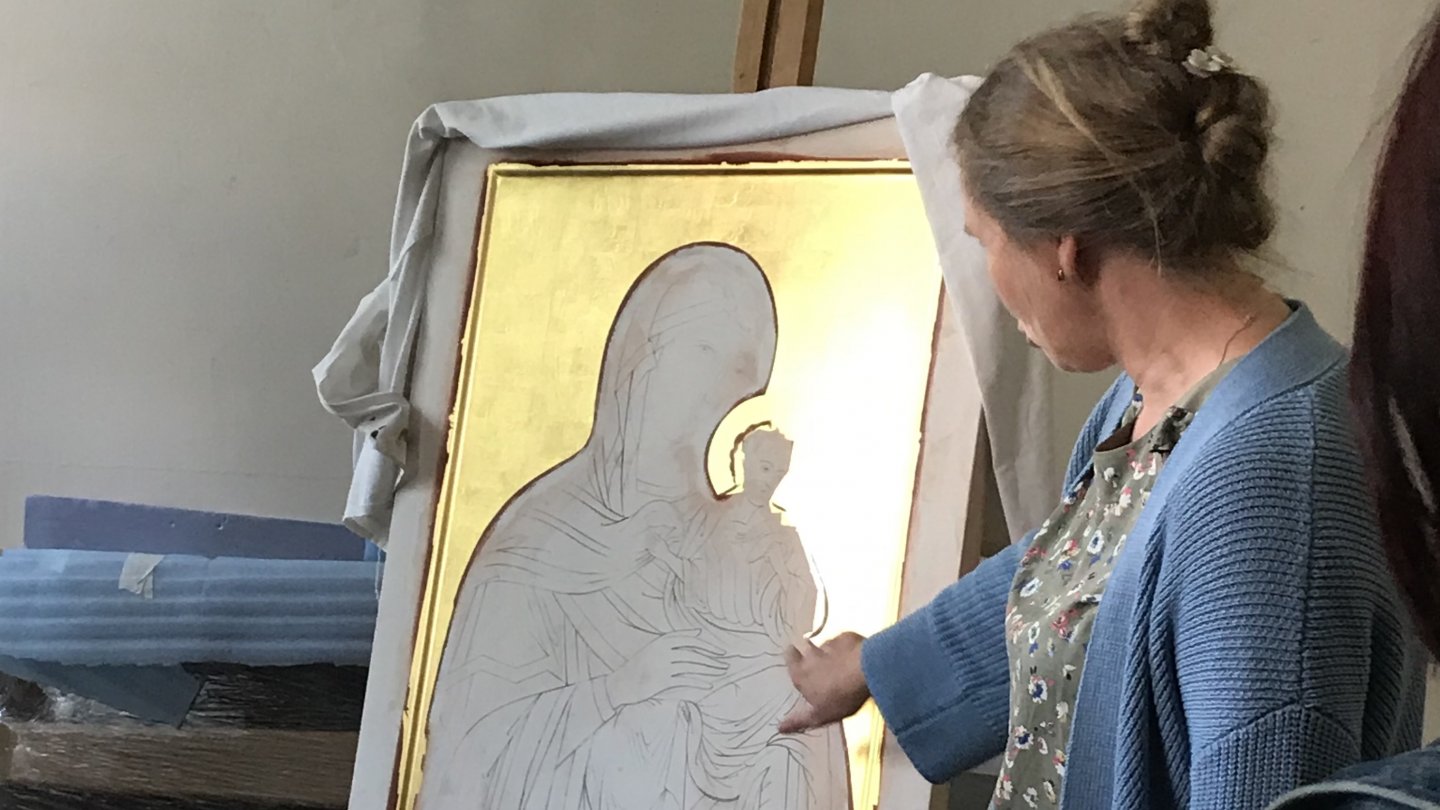 Receiving a lecture about how icons are currently made at the Alexander Nevsky Lavra Monastery.