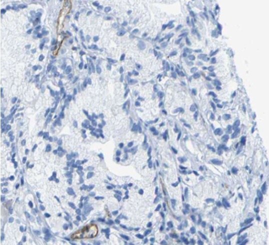 Immunohistochemistry images from the Human Protein Atlas were evaluated as well. The sample with CD93 being stained showed no expression of CD93 protein, which suggests a translational issue with CD93 in prostate cancer. The CD93 mRNA is present, but the protein is not. The image to the right shows a lack of CD93 protein expression.