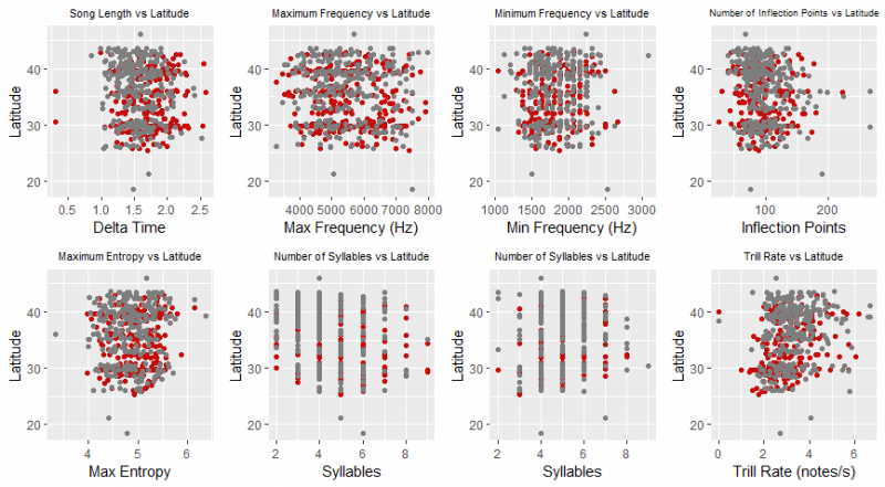 Figure 4: Correlation graphs between latitude and the measures of song length, complexity, and frequency range. Latitude was shown to have correlations with delta time, frequency minimum, number of inflection points, number of syllables, notes per syllable, and trill rate. When graphed, these relationships are not seen very strongly, suggesting the effect of latitude on song variation is extremely minimal.
