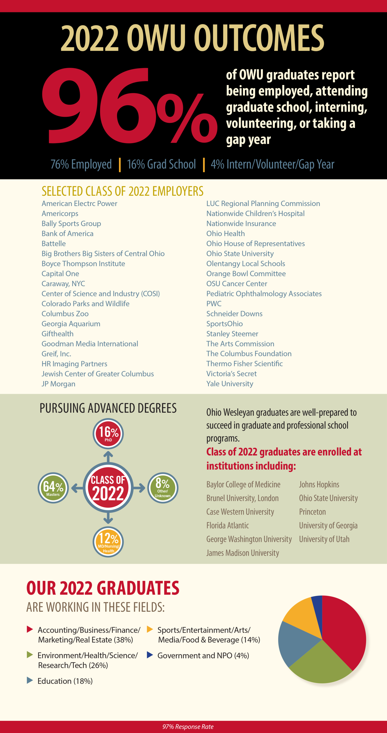 Every year, Career Connection collects survey information from Ohio Wesleyan’s new graduates about where the current phase of their career journey has taken them. In addition, we occasionally conduct additional surveys of our alumni to find out long-term outcomes information, and those reports are also included here.