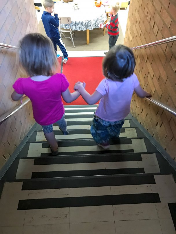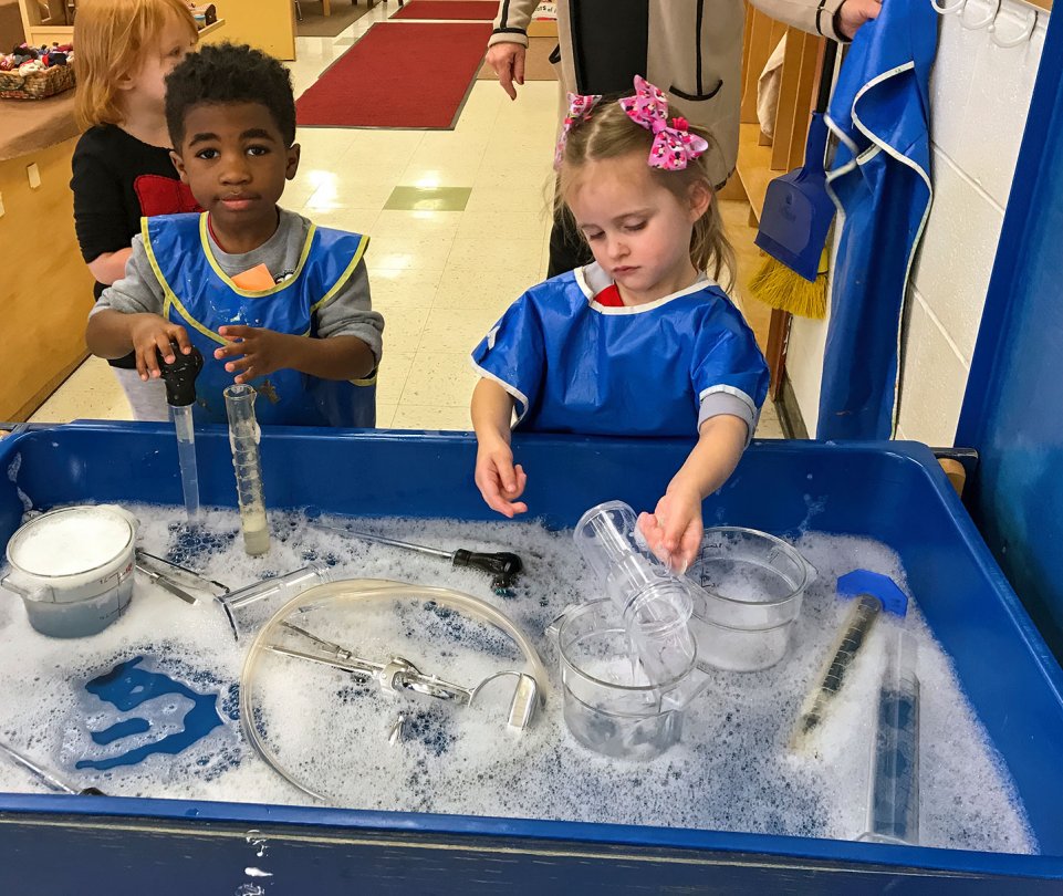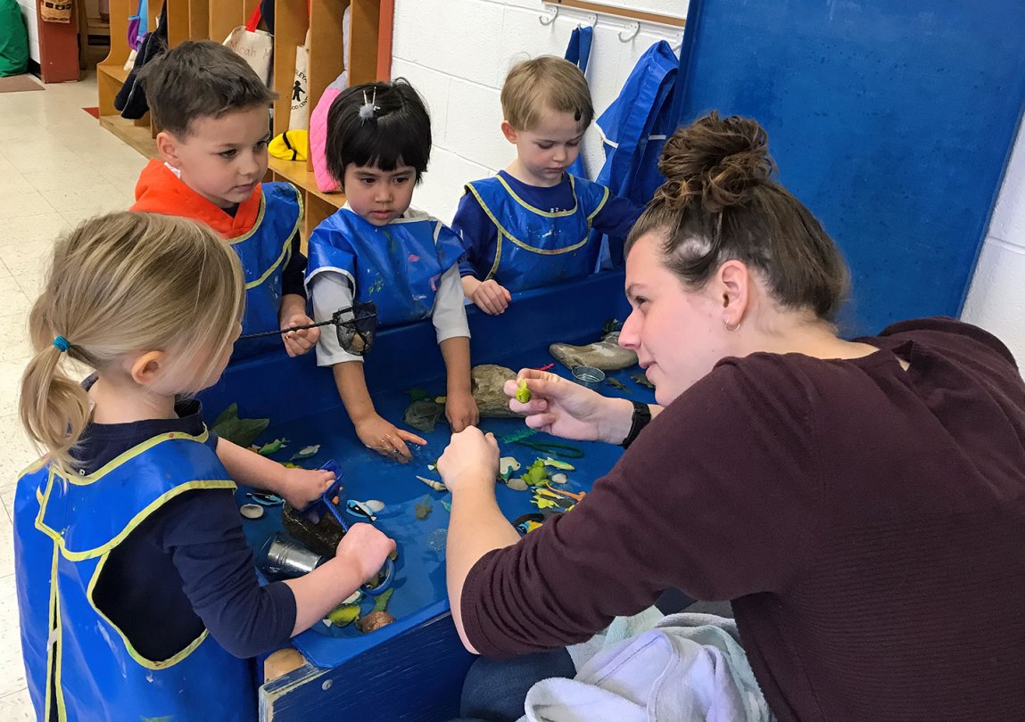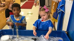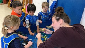 The learning day in each session begins with an hour of Guided Exploration throughout the building. During this time, children are free to choose activities such as studio art, dramatic play, science experiments, math games, block building, and quiet reading all assisted by OWU students and professional staff. At the end of Guided Exploration time, the children meet in designated Focus Groups to work on continuing projects, write in their journals, read and hear stories, have a snack, explore the outside learning environment, sing and dance, and have time in community.