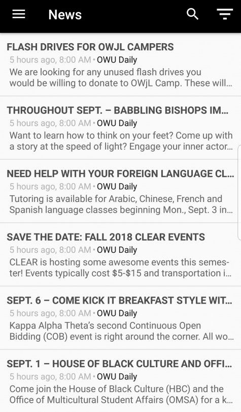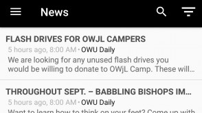 This application pulls in news feeds from OWU. The articles can be read on the device, as well as emailed or shared using social media.