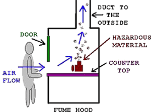 A fume hood confines hazardous airborne material by diluting it with a large amount of air drawn in from the front (open) side of cabinet through an exhaust system, and either expelled outside of the building or made safe through filtration and fed back into the room. The front is a sash window, usually in glass, able to move up and down on a counterbalance mechanism.