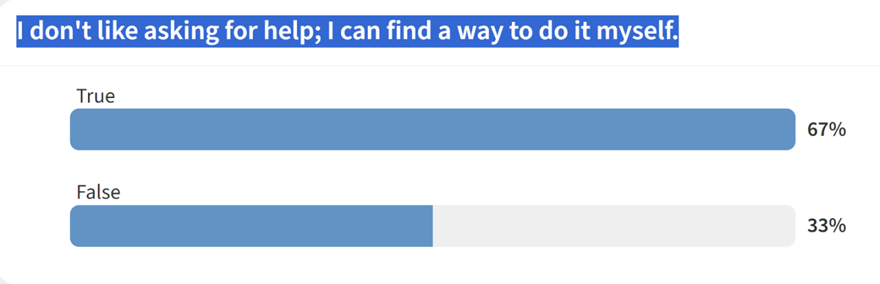 You can start to normalize asking for help from Day 1 by explicitly talking about the role of seeking help in the learning process. On the first day of my Intro-level classes, I use a variety of polling questions to engage students about how they learn, how they study, what they are passionate about, and what they're afraid of. For example, I ask them this polling question, then I facilitate a discussion of why and how they have asked for help, what the results were, how some groups of students are more likely than others to ask for help, and why students that seek help will get further ahead because of it.