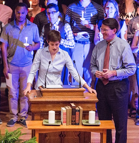 Inauguration Ceremony— Matt (left), Sylvia, Melissa, and Jackson vandenBerg, standing on the stage in University Hall's Gray Chapel after his inauguration ceremony.