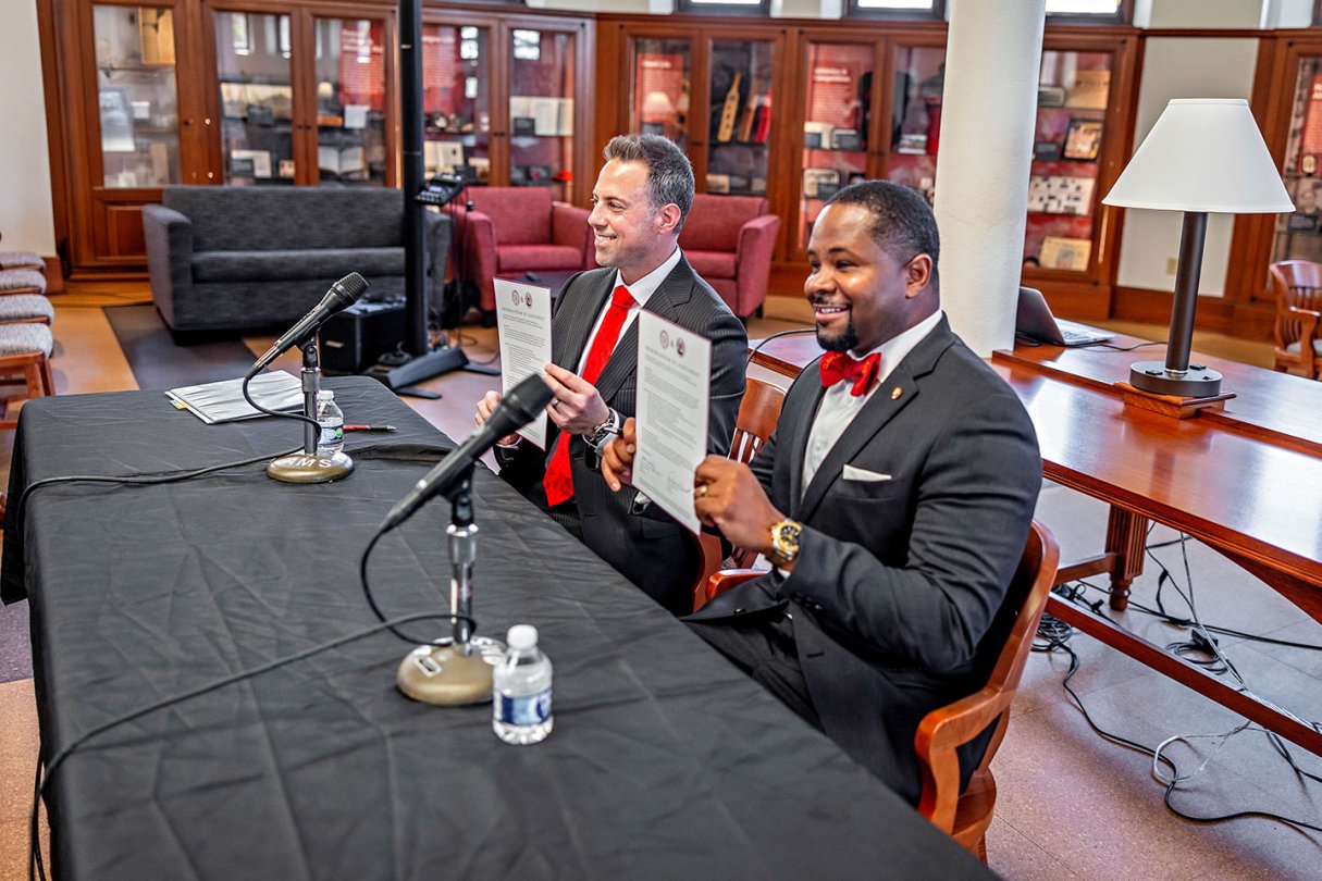 Claflin University Sister School Agreement— Matt vandenBerg (left) and Claflin University President Dwaun Warmack show off the sister school agreement they signed.