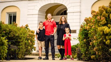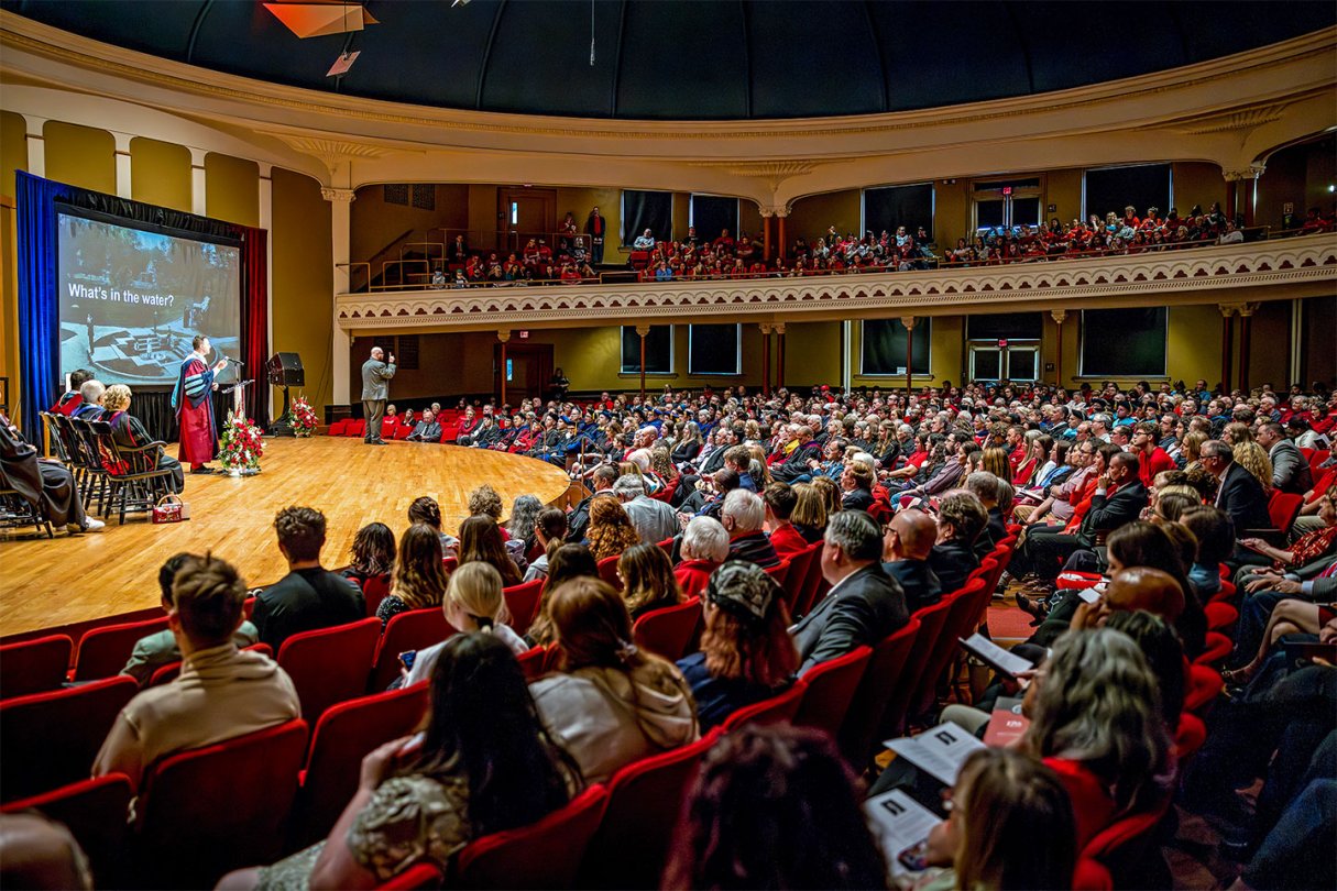 Inauguration Ceremony— Matt (left), Sylvia, Melissa, and Jackson vandenBerg, standing on the stage in University Hall's Gray Chapel after his inauguration ceremony.