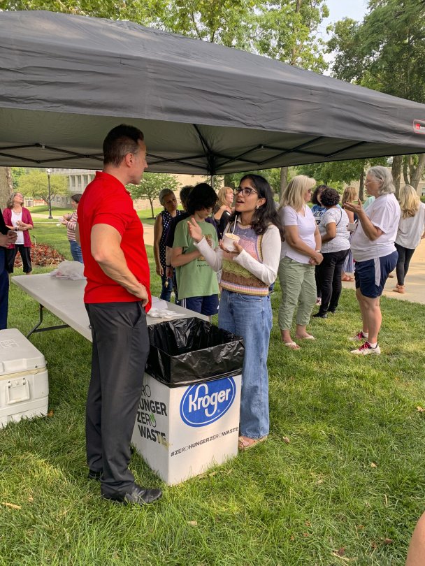 Matt vandenBerg stands with an OWU student at the annual Late Night Breakfast.