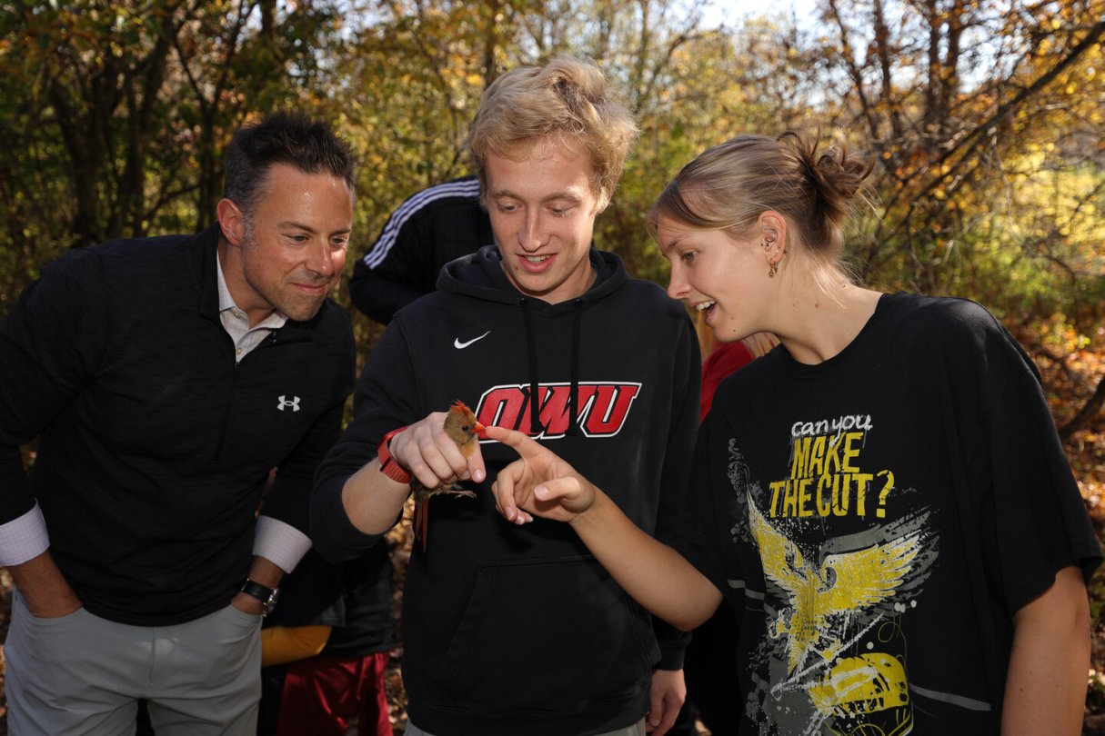 Kraus Wilderness Preserve— Matt vandenBerg (left) observes a female Northern Cardinal with student Evan Miller '24 during a behavioral endocrinology class at Kraus Wilderness Preserve.