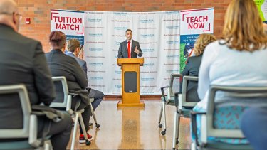 Columbus State Community College Collaborations— Matt vandenBerg speaks prior to announcing three new collaborations with Columbus State Community College.