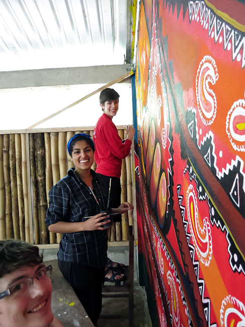 (From top) Students Anna Jones, Megan Pinto, and Matt Mehaffy participating in a mural-painting project in Chiapas, Mexico during the spring 2014 “Modernity & Colonialism” Travel-Learning Course.