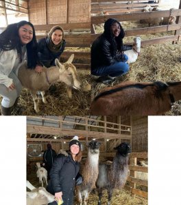 Dr. Shari Stone-Mediatore's Environmental Ethics field trip to Stratford Ecological Center. Pictured: Vicky Bush and Shari Stone-Mediatore with a goat, Keionna Badie with a goat, and Alex Reichardt with a llama.