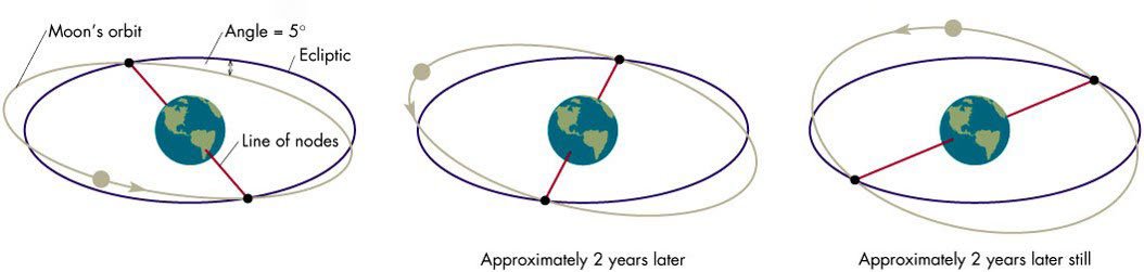 In addition, the line of nodes (the intersection of the moon's and Earth's orbits) precesses once every 19 years, so eclipse seasons drift. Note that January is on the right and December is on the left: