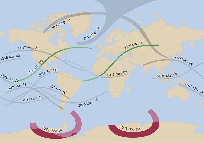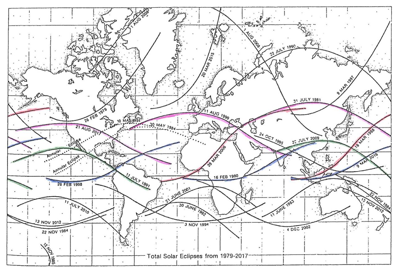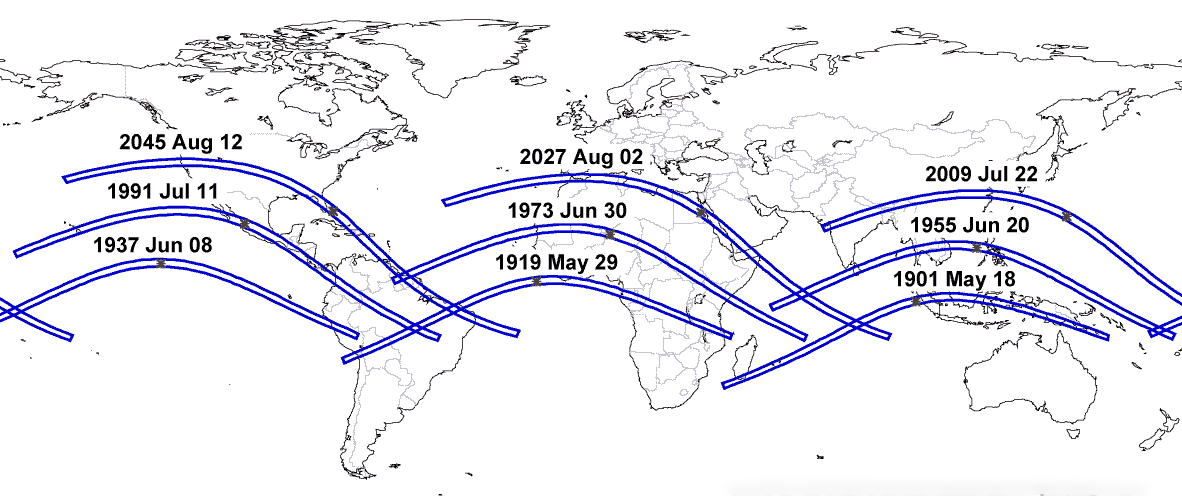 The conditions around the location of the sun and moon relative to Earth and the line of nodes determine the nature of a solar eclipse and the length of totality. Remarkably, these conditions repeat within a very short time frame every 18 years, 11 1/3 days. The similar eclipses that occur at this 18-year interval are part of the same Saros Cycle. The eclipse durations and paths are similar. Consecutive eclipses in the same Saros Cycle occur 120° apart, with each eclipse occur west of the previous one.