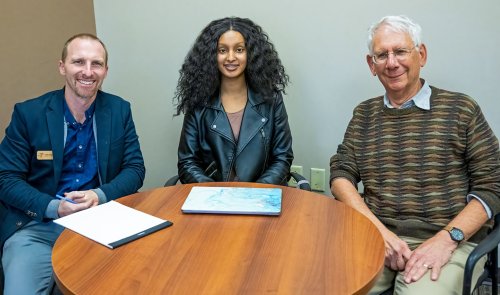 Roger Hanafin (from left) of the Delaware Community Center YMCA is working to learn more about how to serve the BIPOC community with support from Ohio Wesleyan's new Community Research Fellows program. Helping with the project are student Yewoinhareg 'Yoyo' Kebede and professor emeritus Robert Gitter. (Photo by John Hulkenberg)