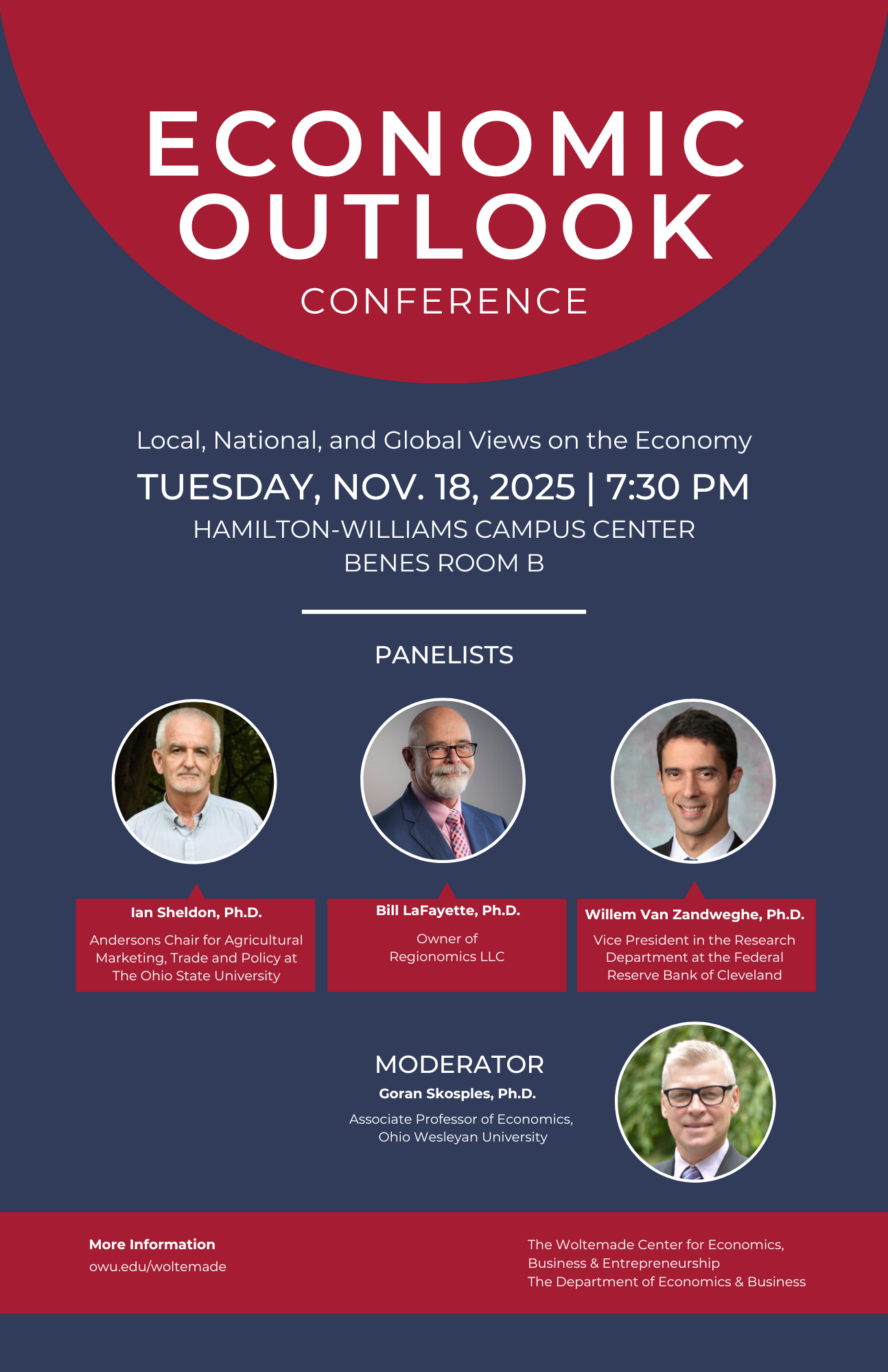 The Economic Outlook Conference is an annual conference organized by the Woltemade Center and the Department of Economics and Business at Ohio Wesleyan University. The Conference typically hosts a three-person panel where each panelist provides either a local, national, or international economic outlook of what can be expected regarding growth, employment, and the overall state of the economy. Out of the three speakers, a national perspective is usually provided by an economist from the Federal Reserve Bank in Cleveland, a local perspective is typically provided by an economist from the Central Ohio area, and an international view is provided by various economists and business persons who deal with international issues in their lives. Each panelist gives a brief presentation of about 10-12 minutes, which is followed by a discussion among panelists and finally, questions from the audience. Usually the program draws a substantial audience from both the campus and local community.