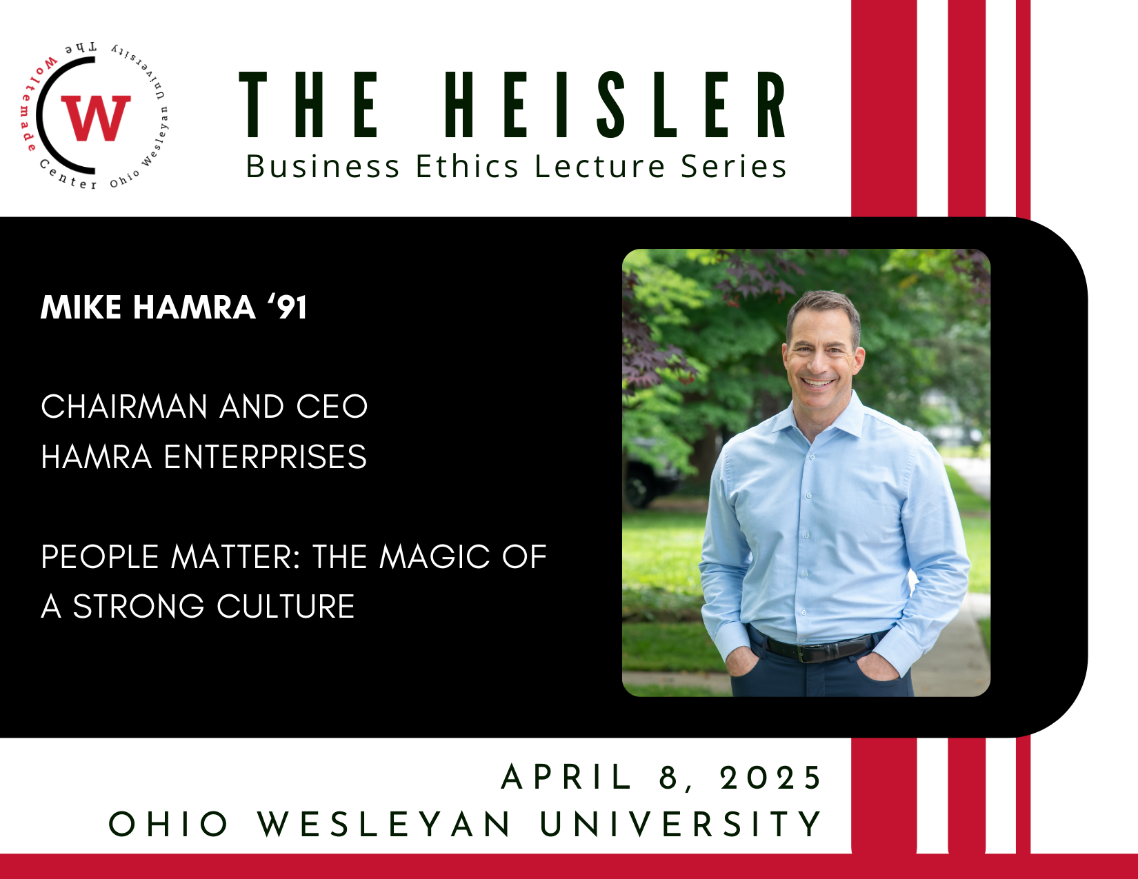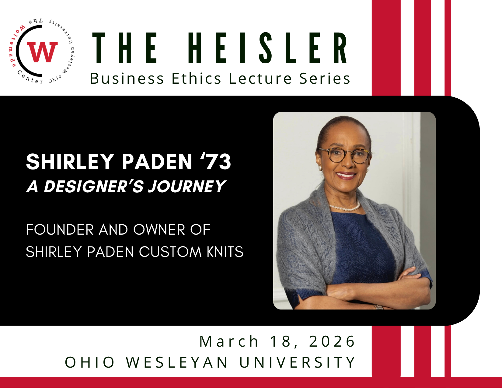Ohio Wesleyan's annual Heisler Business Ethics Lecture is sponsored by the university's Woltemade Center for Economics, Business, and Entrepreneurship and funded by the Heisler Family Endowment for the Study of Ethics. The endowment honors OWU graduates James Heisler, Class of 1938; Robert Heisler, Class of 1942; and Bruce Heisler, Class of 1949. The Woltemade Center, founded in 1985, helps students to integrate business theory and practice, and provides lectures and other resources to benefit students, faculty, and the local community.