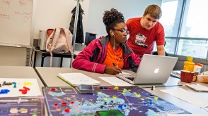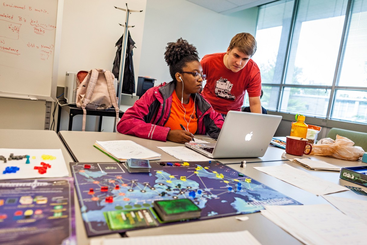 From left, Mira Jacobs (Syracuse University) and Eugene Kramskoi '19 work to create a program that will intelligently play the board game Pandemic, a summer research project with Mathematics & Computer Science Professor Sean McCulloch.