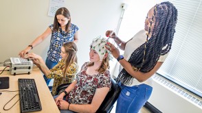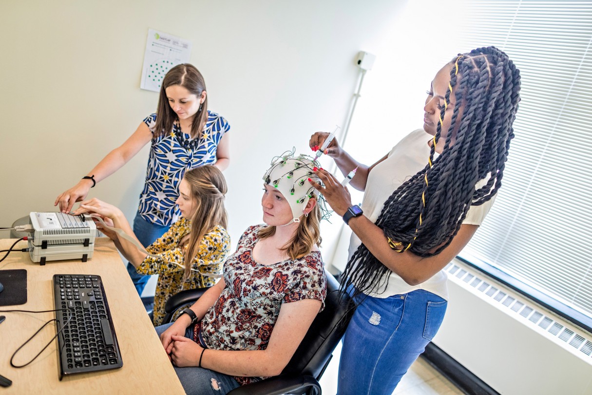 From left, Psychology Professor Kira Bailey works with Lexi Lease '19, Mickey Rice '19, and Malia Walker '19 on a summer research project to study the effects of video game exposure on cognitive control.