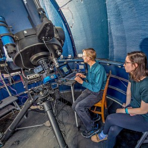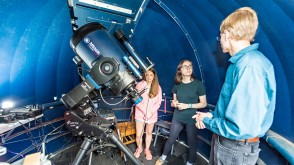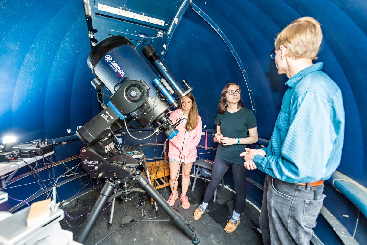 Physics & Astronomy Professor Robert Harmon (right) explains the workings of the student observatory to Amanda Jewell '19 (center) and Brooke Kimsey-Miller (Indiana University) during a summer research project in which they collected data on starspots.