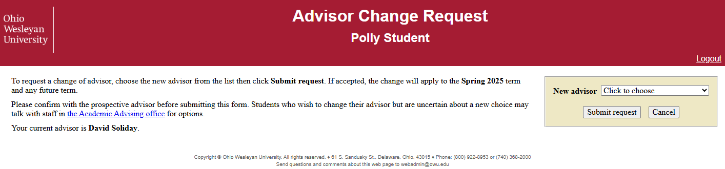 To request a change of advisor, choose the new advisor from the list then click Submit request. Please confirm with the prospective advisor before submitting this form. Students who wish to change their advisor but are uncertain about a new choice should reach out to the Office of Holistic Advising for options.