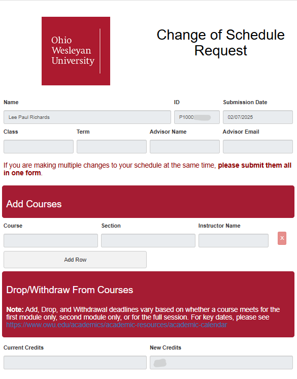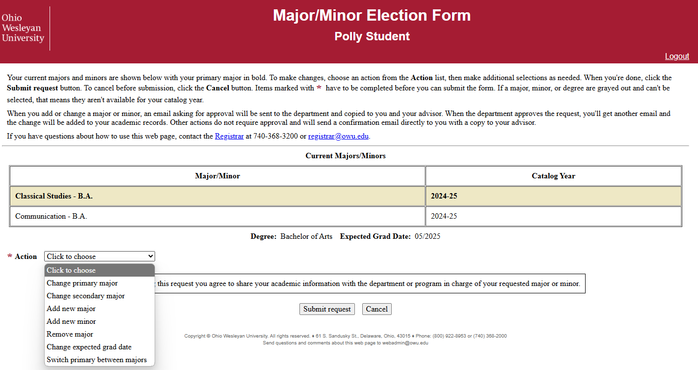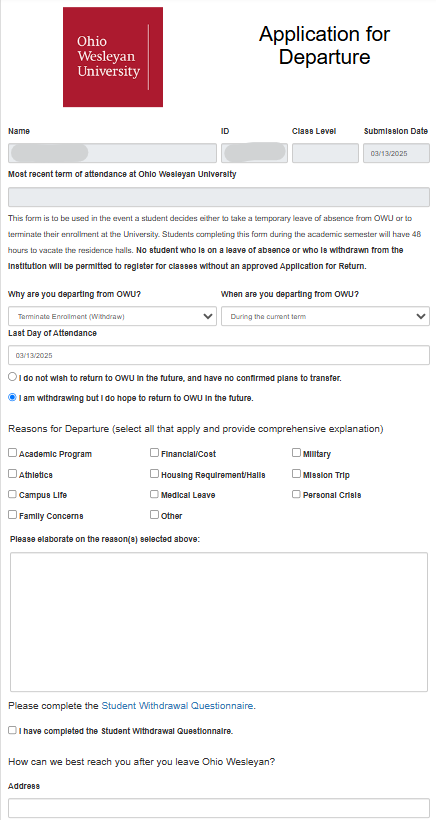Complete this form either to request a temporary leave of absence or to terminate your enrollment at the University. Students requesting to depart may be asked to meet with Dr. Brad Pulcini, Dean of Student Services, for an exit interview before the request is approved. (Questions can be emailed to btpulcin@owu.edu.)