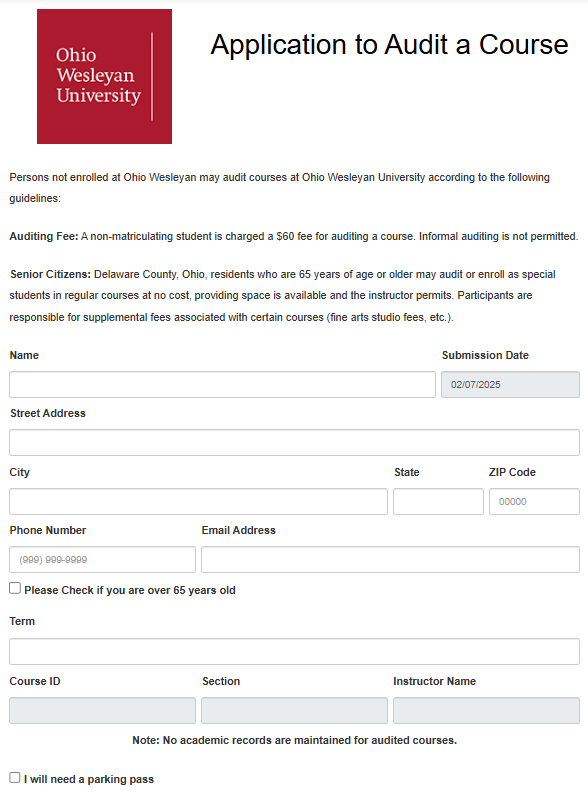 No academic records are maintained for audited courses, so you will not officially be registered for the course and will not have a transcript. Informal auditing is not permitted. Persons not enrolled at Ohio Wesleyan may audit courses at Ohio Wesleyan University (providing space is available and the instructor grants permission). The $60 course audit fee is waived for residents of Delaware County, Ohio who are 65 years of age or older. The waiver of the audit fee does not cover special or supplemental course fees (including, but not limited to, activity and fine arts courses). All participants, including auditors, are responsible for paying these specific course fees).