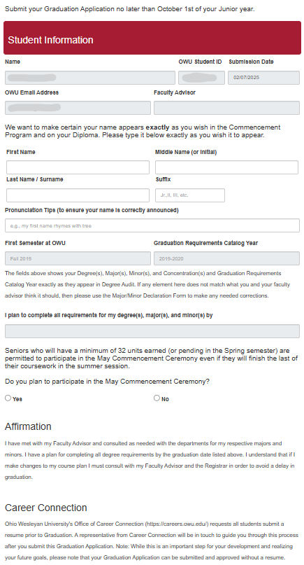 Former students not currently enrolled at OWU who wish to return should complete this form. Students currently taking a leave of absence must complete this form as well. Applications deadlines are as follows: Fall – July 1, Spring – November 15, and Summer – April 15.