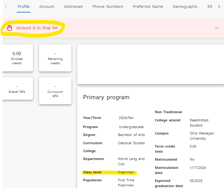 Check your Self-Service Profile for any holds (that would prevent you from registering (even if your advisor has given their authorization). For example, if you see an Account Balance Hold like this, contact the Office of Student Accounts at studentaccounts@owu.edu to resolve the hold at least one business day prior to your registration window. - Register for Classes!