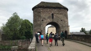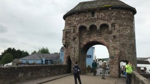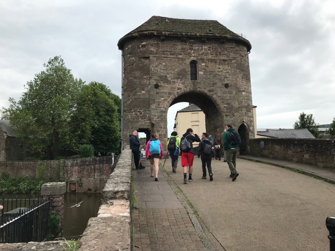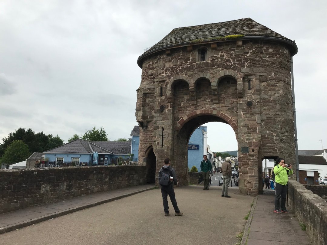 Crossing the stunning 13th-century Monnow Bridge, with its fortified tower.