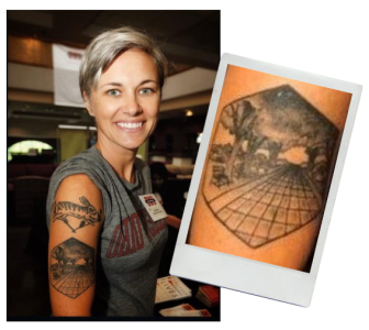 That question was recently answered when I spotted a brief story in OWU’s online news archive about OWU alum, September Howat, Class of 2000, and her most unusual tattoo. The photo accompanying the article shows a vibrantly smiling September proudly showing off a detailed tattoo on her upper right arm. The delicately tattooed image is “our” Slocum Walkway and trees!