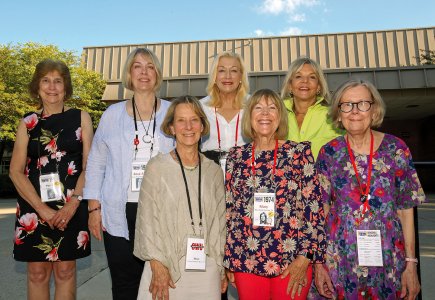 Gamma deuteron members returning to OWU for their golden anniversary are pictured from left, front: Diane Stedman Rees '75, Mary Snoke Dunham '74, Lori Farquhar '74; back: Penny Lee Speidel '74, Rose Anna Coleman Kolar '74, Marie Eslinger Horowitz '74, and Jan Kennedy Lail '74. (06/25)