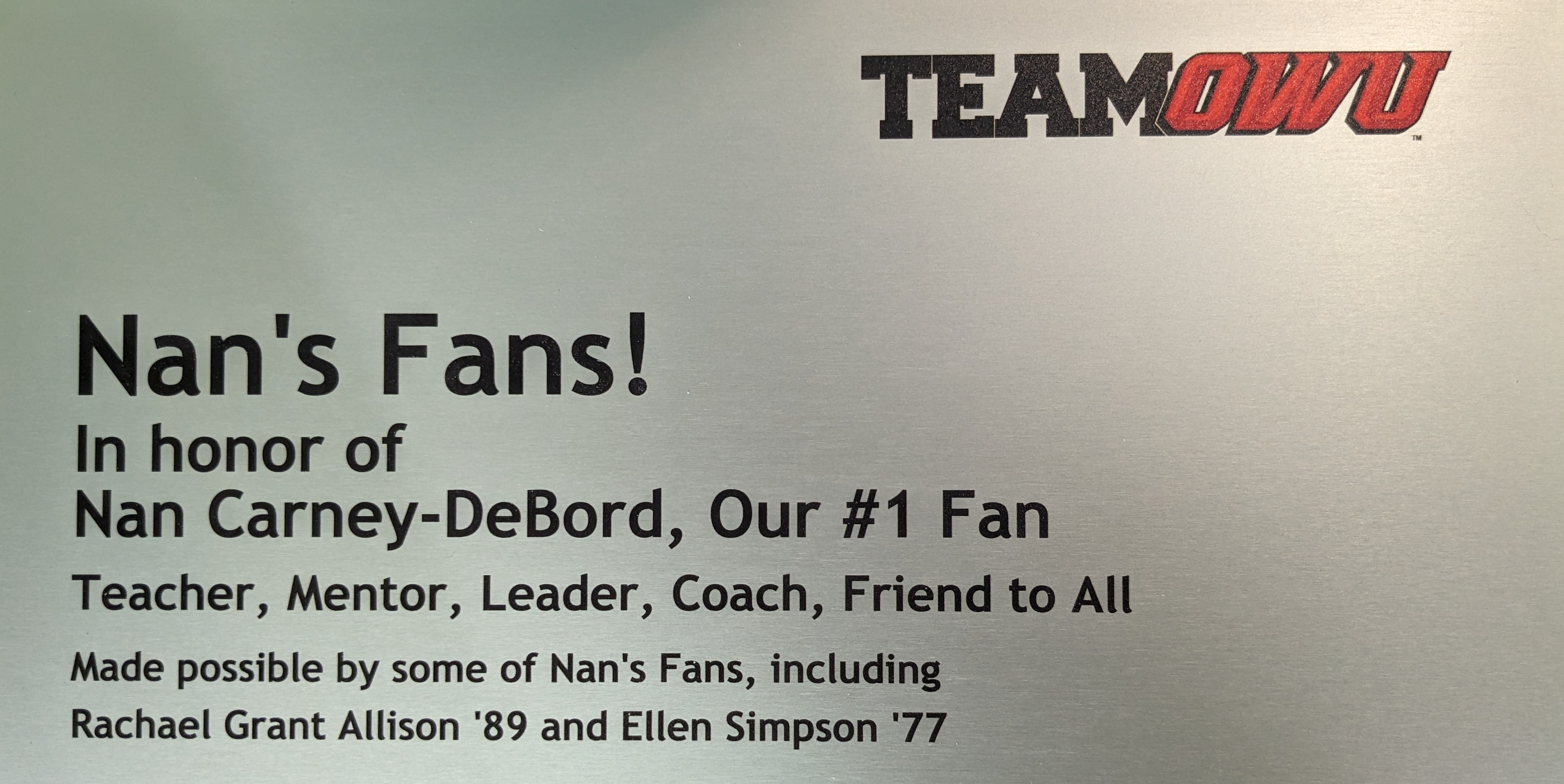 In reaction to Ellen and Rachael’s news of the “Nan’s Fans” plaque, Nan says she felt overwhelmed and honored. “First of all, this is one thing I took with me, and quote often from Branch Rickey, ‘It is not the honor you take with you, it is the heritage you leave behind.’ If I had a positive impact in lifting other strong women, then I know my time at OWU was successful,” Nan says. “Most significantly, life is about relationships I formed on and off the courts with colleagues and athletes. I valued my time at Ohio Wesleyan. I lived it, owned it, and absorbed it. It owned my heart.”