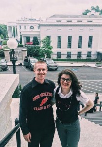 Kyle Herman ’11 and Anna Cooper ’13 are pictured in front of the White House, where Kyle is employed as an analyst, and where Anna was associate director of technology and operations for presidential personnel until May.