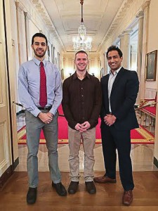 Kyle (middle) was visited at work by Usman Javaid ’10 (right) and Sharif Kronemer ’12 (left). The three men are all former leaders of the Wesleyan Council on Student Affairs, OWU’s student government.