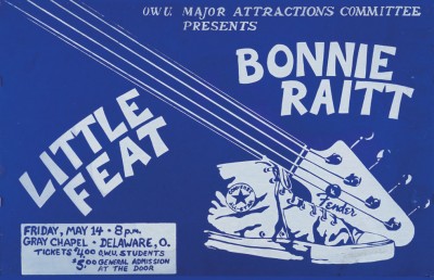 ERIC: I still say Bonnie Raitt at OWU was the best concert I’ve ever attended. Freebo (Daniel Friedberg) was playing bass and Billy Payne was on piano. I love to tell the story of how Bonnie did two encores and told us that if we kept showing this kind of appreciation for artists, we’d get “the cream of the crop.” Then, to make it even more extraordinary, Bonnie and Little Feat were not touring together, so it was a one-off combination Doug was able to put together just for OWU.