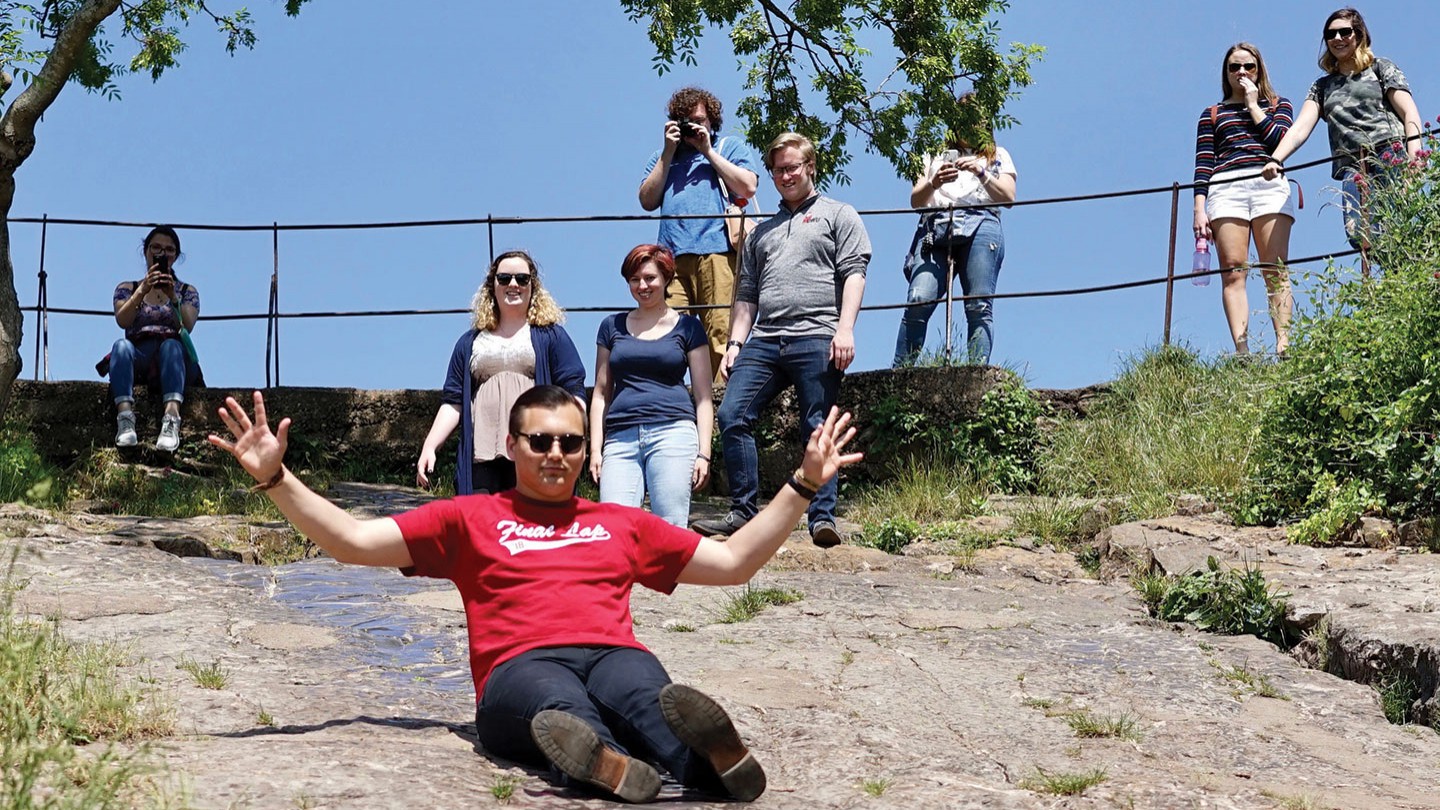 Guillo Gutierrez ’18 takes a turn down the Clifton rock slide near an observatory in Bristol, England. As described by The Guardian “this natural slide is nothing more than a sloping band of rock polished to shiny slipperiness by decades of dedicated bottoms.” Guillo is cheered on by classmates in the travel-learning course “Space Exploration: Past, Present and Future,” taught by professor of physics and astronomy Robert Harmon, (from left): Zoey Rosenthal ’18, Julia Anne Caple ’20, Haley Talbot-Wendlandt ’18, Dexter Allen ’21, Alec Martin ’19, Gracie Clevenger ’21, Emily Ehrhart ’20, and Sami Bates ’20. The group visited England and Germany in May and toured European Space Agency facilities and other European observatories. (Photo by Reilly Wright ’20)