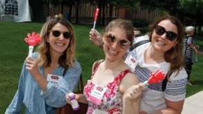 Class of 2008 classmates (from left): Jessica Nare, Amandine Weinrob, and Alison Gary Mengerink grabbed some noise-making clappers and bubbles for the Parade of Classes on the JAYwalk.