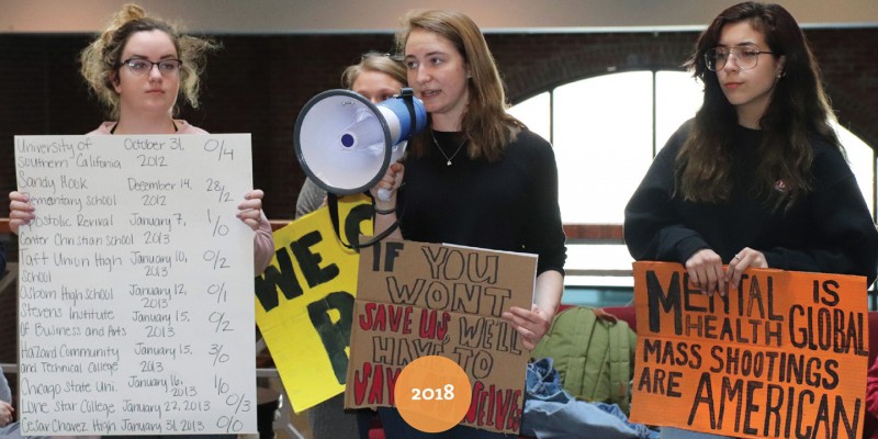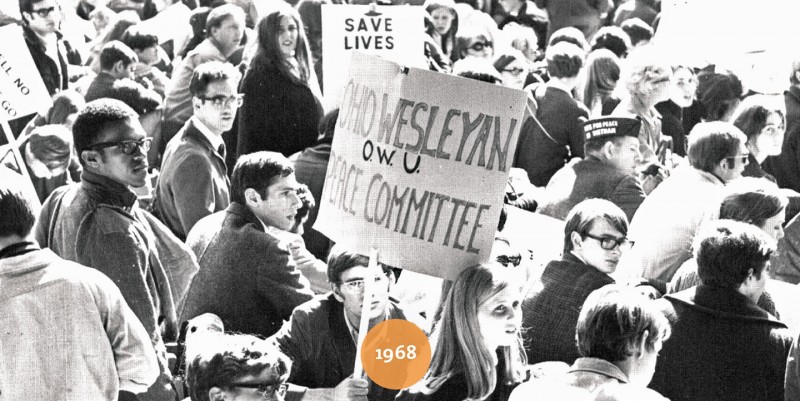 Times may have changed, but protests remain a campus staple. Students on the Ohio Wesleyan Peace Committee (top), who involved the campus in an international fasting movement against the Vietnam War, gathered to support their cause in this photo from the 1968 yearbook. On March 23 of this year, students (from left) Julia Anne Caple ’20, Haley LaRoe ’18, and Patience Savino ’21 were among dozens participating in the March for our Lives kickoff rally to draw attention to gun violence, held in Hamilton-Williams Campus Center (Photo by Gopika Nair ’18). Author and columnist Richard North Patterson ’68 explores other echoes of 1968 in 2018 in the 1968 vs. 2018 story in this issue.